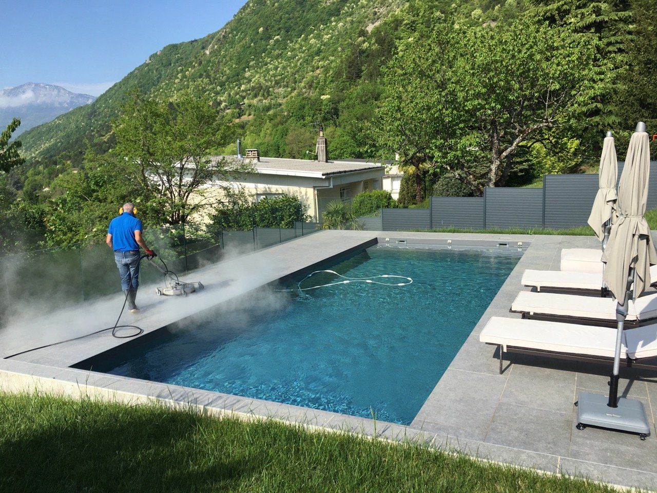 terrasses, piscines, façades, sols extérieurs, parkings, pistes poste essence, places publiques, campings, trottoirs, toilettes publiques, conteneurs à poubelle...